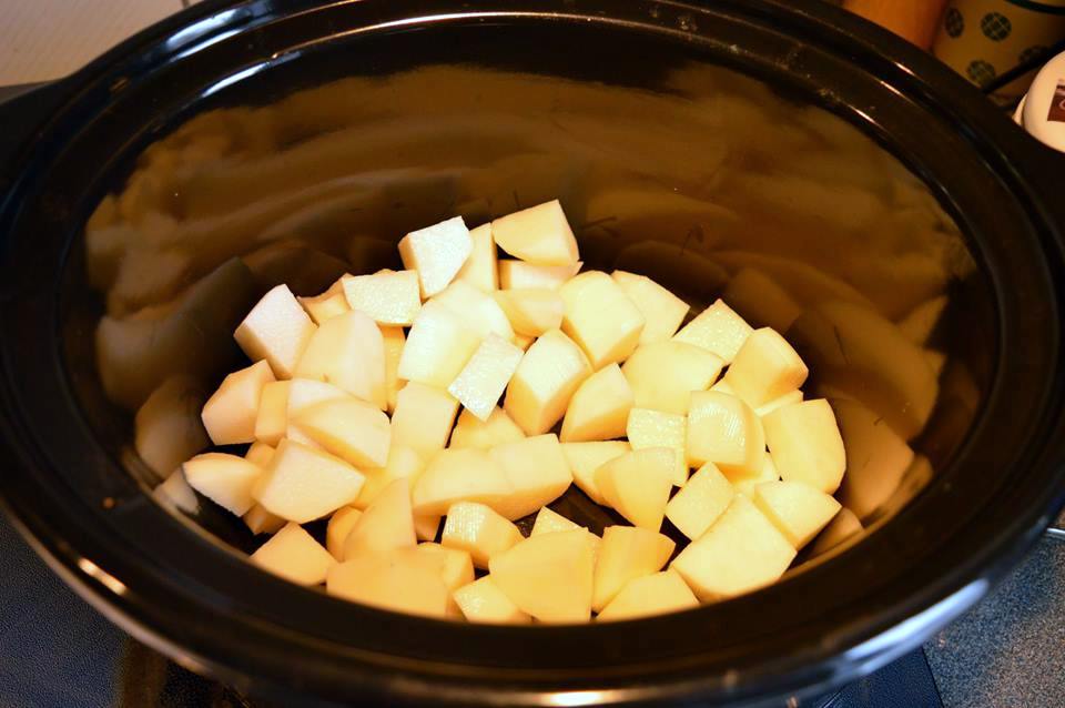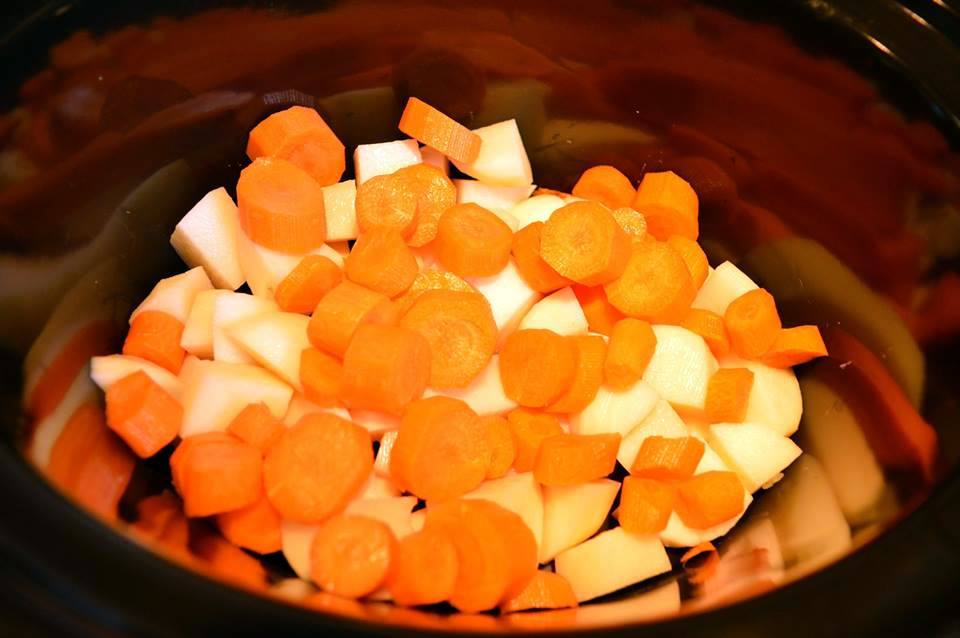 Entre temps, préparez les légumes en épluchant les pommes de terre et les carottes puis les couper en morceau. Déposez-les dans le fond de la mijoteuse.