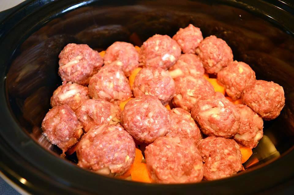 Lorsque le mélange d’œuf est plus épais, ajoutez les viandes et l’oignon. Mélangez. Formez de petites boulettes et déposez-les dans la mijoteuse sur les pommes de terre et les carottes.