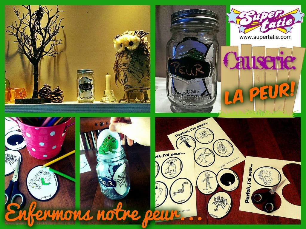 Les dessins proposés par Super Tatie peuvent convenir… Par conséquent, lorsque les enfants sont plus vieux, les peurs peuvent devenir un peu plus complexes et/ou personnelles. Il n’est peut-être pas nécessaire de faire présenter la peur de tous et chacun en grand groupe pour la dernière partie. Demandez à l’enfant d’écrire ou d’illustrer sa plus grande peur sur un bout de papier. Et faites le même principe pour enfermer cette dernière dans un pot. Si un enfant se sent à l’aise d’en parler ouvertement, laissez-le faire. C’est qu’il en a de besoin. Et participez vous aussi, en tant qu’adulte. Les enfants constateront qu’il ne s’agit pas juste d’une émotion que l’on vit lors de l’enfance.