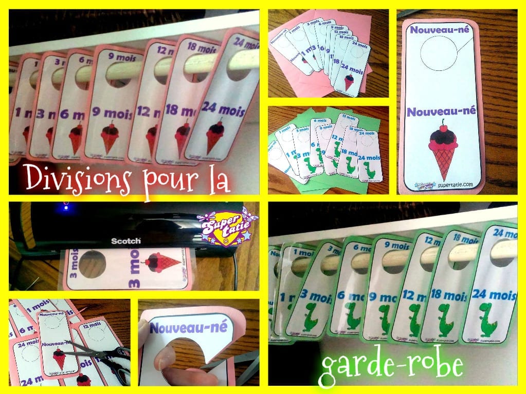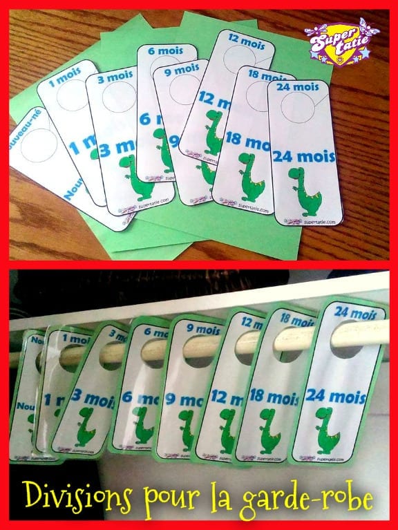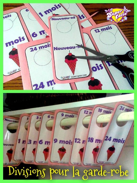 Il suffit que de télécharger et imprimer le document désiré. Découpez les diviseurs, collez ces derniers sur un carton très rigide (pour plus de durabilité, plastifiez le tout) et installez le tout dans la garde-robe de votre poupon. Simple, pratique et efficace!