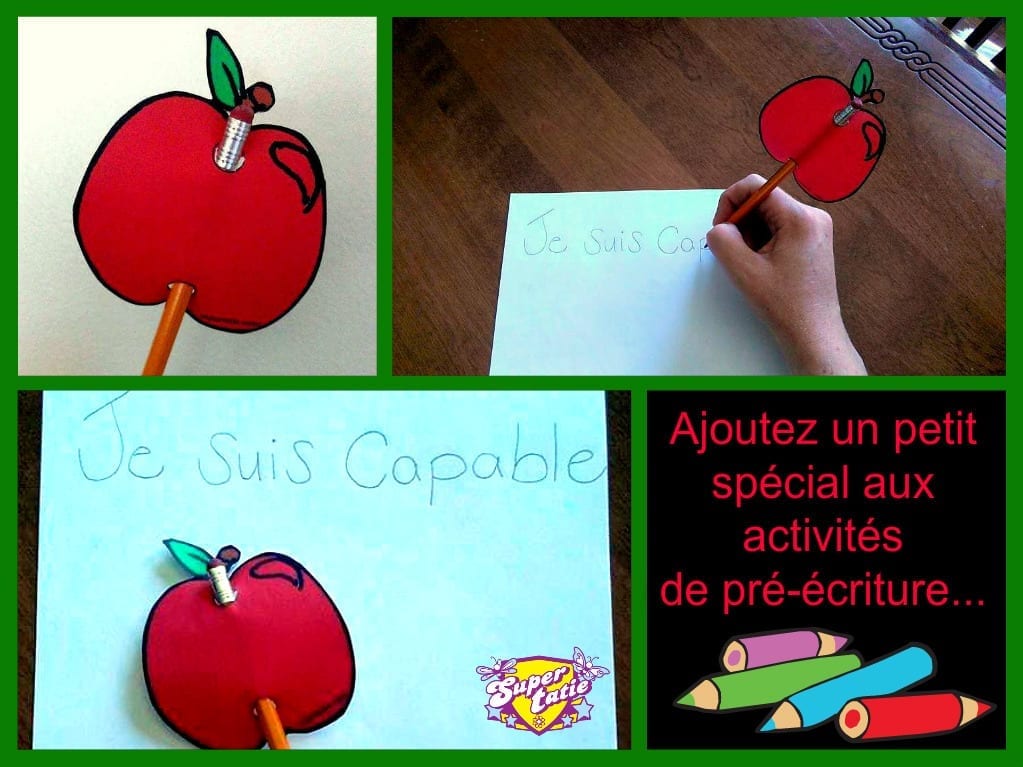 Certains enfants ont moins d’intérêts à réaliser une fiche cognitive. Parfois, l’ajout d’un accessoire peut aider à piquer la curiosité de ceux-ci. Pour le thème « Les Pommes », Super Tatie offre la possibilité à ses membres de confectionner des pommes de sorte à agrémenter ses crayons d’écriture. Vous aurez le choix de faire colorier les pommes par les enfants ou encore d’imprimer ces dernières en couleurs.