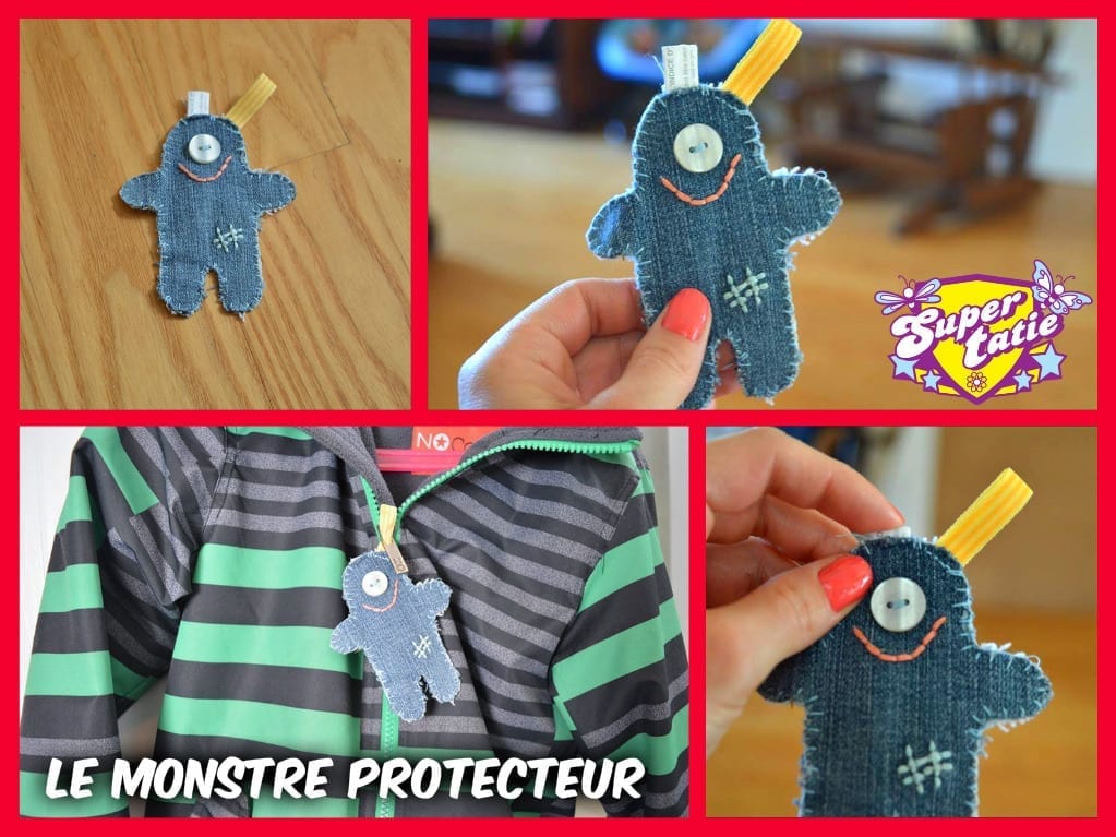 J’ai récupéré un vieux jeans que j’avais et j’ai tracé la forme de mon monstre. Je l’ai découpé deux fois, décoré un morceau d’un œil bouton, fait une bouche en broderie. J’ai ensuite fait une couture à la main autour du monstre en laissant un espace en haut pour y insérer le papier contenant toutes nos informations.