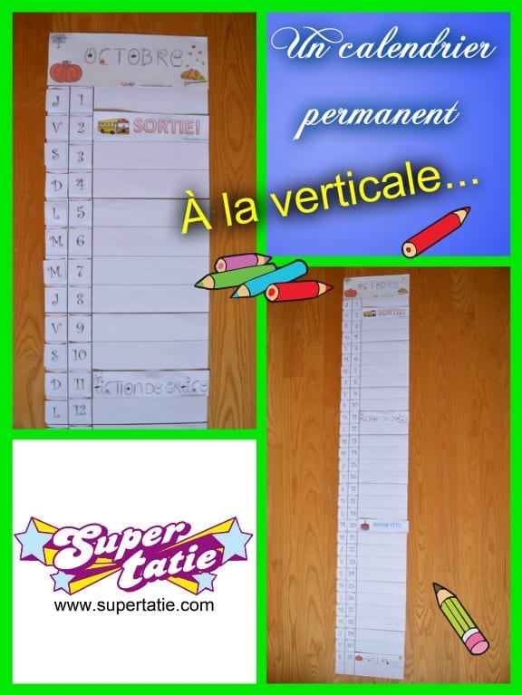 Super Tatie vous propose d’utiliser un calendrier annuel géant que vous pouvez installer sur un mur de votre salle de jeux. La particularité de ce calendrier est qu’il est fait sur la verticale afin d’aider les enfants à mieux se situer dans le temps. En effet, il est plus facile pour un enfant d’âge préscolaire de lire du haut vers le bas. Il s’agit d’une suite logique et acquise à cet âge. Vous pourrez le personnaliser grâce à nos images ainsi qu’à indiquer les date importantes comme les fêtes par exemple pour une sortie spéciale où que l’enfant compte les dodos ou justement une fête excitante comme l’Halloween. Pour un usage durable, coller chaque cadrage sur un carton rigide et appliquez une pellicule de plastique adhésive. Sinon, il vous est possible de tout plastifier tout simplement.